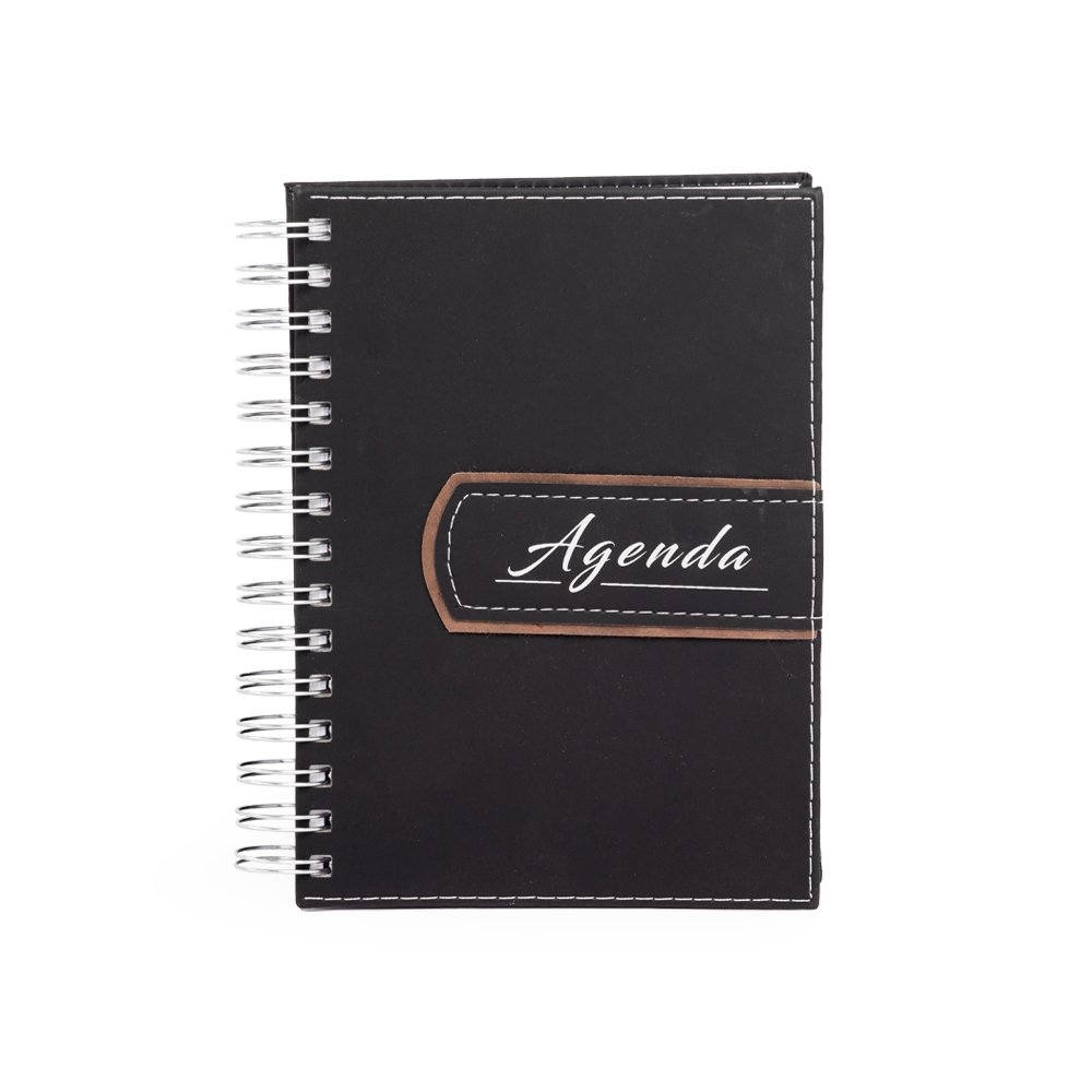 Agenda diaria 2025 em couro sintetico com wire-o. Possui “bolso” plastico, pagina para dados pessoais, calendario 2024 a 2026, mapa do Brasil, mapa global, indice telefonico e planejamento. OBS.: PEDIDOS APENAS MULTIPLOS DE 10 PECAS!