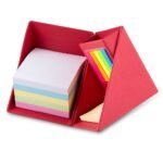 Bloco de anotacoes formato cubo com autoadesivos, abre e fecha em diagonal. Possui 5 blocos autoadesivos com aproximadamente 20 folhas cada, bloco amarelo com aproximadamente 50 folhas e conjunto de blocos com 4 cores e aproximadamente 100 folhas cada. Possui suporte para caneta, clips e afins no compartimento atras bloquinhos coloridos.
