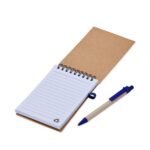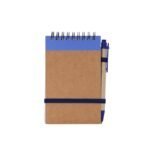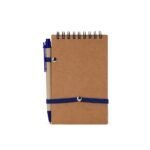 Bloco de anotacoes ecologico com caneta, feito em kraft com detalhe plastico. Contem aproximadamente 70 folhas brancas com pauta, porta caneta elastico, elastico para lacre e acompanha caneta de papelao com detalhes plasticos, carga esferografica azul 1.0mm e acionamento por clique.