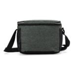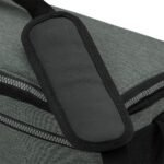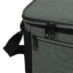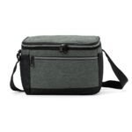 Bolsa termica de nylon 10 litros com dois compartimentos, sendo o principal com revestimento termico e bolso telado para utensilios. Possui bolsos laterais em malha e alca transversal com apoio para ombro.