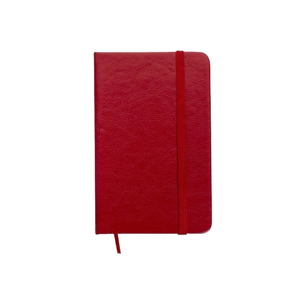 Caderneta de couro sintetico com elastico para lacre e marcador de pagina em cetim, contem 80 folhas pautadas.