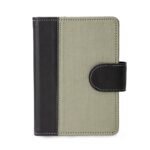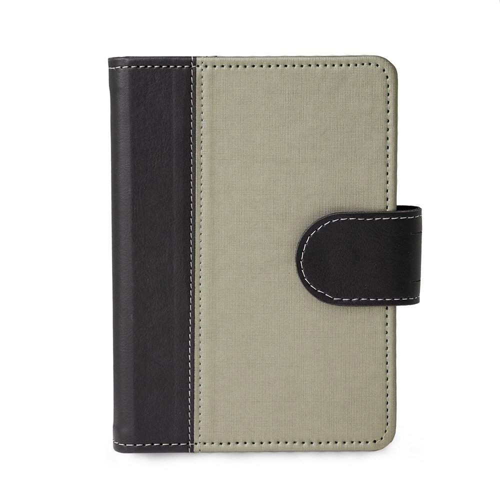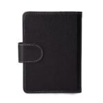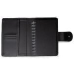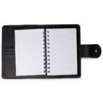 Caderneta de couro sintetico com fechamento de botao. Possui caderno capa dura em couro sintetico com aproximadamente 100 folhas pautadas, divisorias para cartoes e bolso lateral.