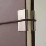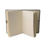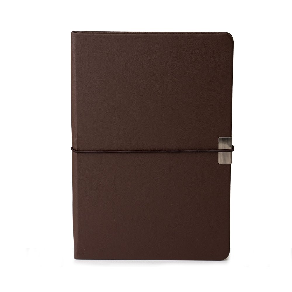 Caderneta em couro sintetico com detalhe metalico, marcador de pagina em cetim e fita elastica para fechar. Contem aproximadamente 96 folhas marfim com pauta.