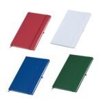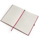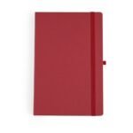 Caderneta em percalux com marcador de pagina em cetim e fita elastica para fechar. Contem aproximadamente 80 folhas sem pauta.