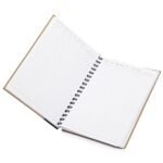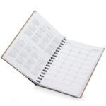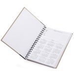Caderno com capa kraft e espiral metalico. Possui aproximadamente 85 folhas brancas pautadas e folhas destinadas aos dados pessoais, calendario de 2024 a 2026, planejamento e contatos.