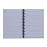 Caderno com capa kraft colorida e espiral prata metalico. Possui aproximadamente 98 folhas brancas pautadas e paginas para: dados pessoais, calendario de 2023 a 2026 e planejamento.