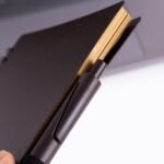 Caderno ecologico com caneta plastica: bloco de anotacoes com elastico e suporte para caneta, produzido com graos de cafe e polipropileno, aproximadamente 70 folhas com pauta, caneta plastica com acionamento por clique.