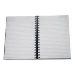Caderno emborrachado de frente e verso lisa com espiral preto. Possui dados pessoais, calendario de 2024 a 2026, aproximadamente 100 folhas brancas pautadas com detalhe “data” na parte superior de cada folha.