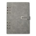 Organize todas as anotacoes de forma pratica com o nosso caderno fichario em PU. Com um design super elegante, ele tem capa dura no formato A5 e um fechamento de fivela imantado que protege as 119 folhas em papel marfim. Os seis aneis permitem retirar e reorganizar as folhas sempre que precisarem, deixando tudo do seu jeito. E para completar, a primeira folha traz um espaco especial para dados pessoais. Esse caderno fichario e a escolha perfeita para manter tudo organizado e com muita sofisticacao.
