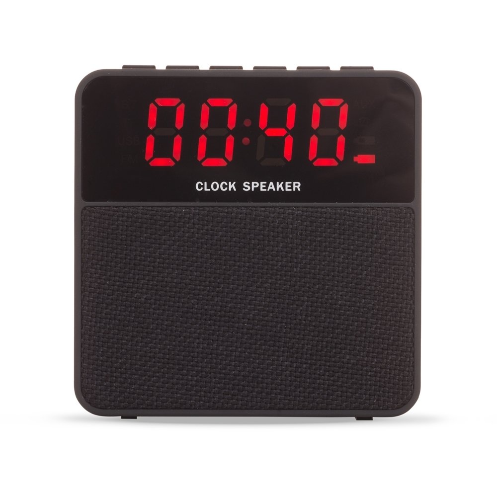 Caixa de Som Multimidia com relogio digital. Material emborrachado com display superior frontal, tela de protecao dos falantes em tecido, parte inferior com borrachas anti-deslizantes. Possui botoes de Relogio/Alarme; Telefone/Atender chamadas; Mode; – retroceder/diminuir; + avancar/aumentar; Play/Pause/Troca; Microfone; Botao on/off; Entrada auxiliar P2; Entrada DC 5V; Entrada USB e Entrada TF (cartao MicroSD). Acompanha cabo USB e manual de instrucoes em chines/ingles.