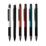 Caneta touch screen em metal com acabamento similar a borracha. Acionamento por clique e carga esferografica azul 1.0mm.