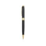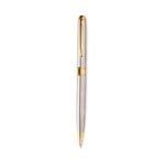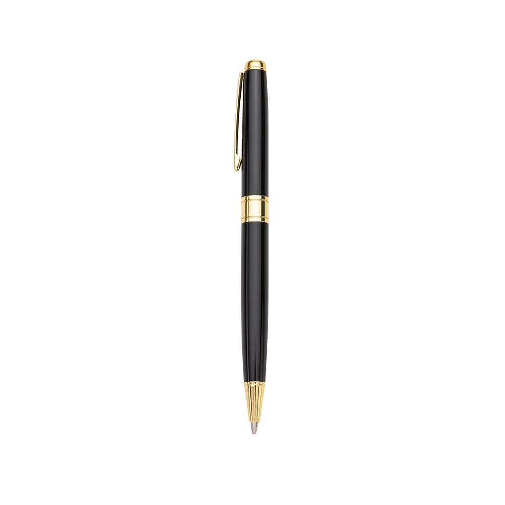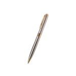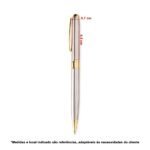 Caneta metalica com carga esferografica azul e acionamento por rotacao.