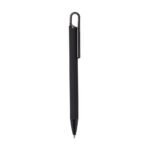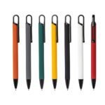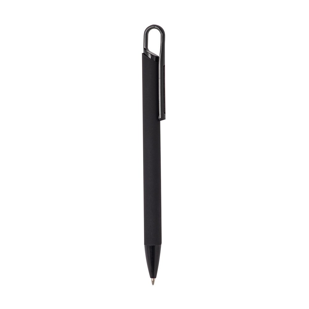 Caneta metalica com acabamento similar a borracha, clipe e ponteira plasticas, carga esferografica azul 1.0mm e acionamento por clique.