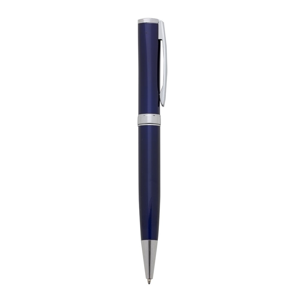 Caneta metalica com carga esferografica azul 1.0 mm e acionamento por rotacao.