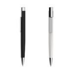 Caneta metal triangular de pintura fosca e detalhes em prata. Clip metalico espelhado, aciona por clique.