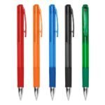 Caneta plastica translucida colorida com detalhe inferior emborrachado. Aciona por clique e e destravado pressionando a parte inferior do clip.
