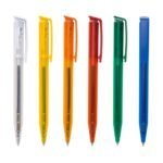 Caneta plastica com carga esferografica azul e acionamento por clique. QUANTIDADE MINIMA 200 PECAS!