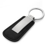 Chaveiro de metal brilhante com detalhe de couro sintetico, frente lisa e verso com um parafuso.