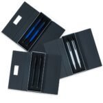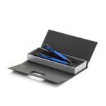 Conjunto caneta e lapiseira design triangular em estojo com plaquinha personalizavel. Caneta esferografica na cor azul e lapiseira grafite 0.5 mm, acionamento por clique. X E-mail: Nome: Seu nome: Caracteristicas Tecnicas Caneta e lapiseira: Metal Estojo: Cartonagem Caneta e lapiseira (C x L): 14,1 cm x 1,4 cm 1 Medidas para gravacao (A x L): 0,7 cm x 4,5 cm Estojo (C x L x E): 18,1 cm x 6,6 cm x 2,7 cm 2 Medidas para gravacao (A x L): 1,7 cm x 4,1 cm