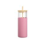 Copo de vidro borossilicato com capacidade de 500ml. Inclui canudo e tampa de bambu com abertura para canudo, alem de uma luva de silicone para melhor aderencia.