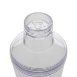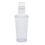 Coqueteleira de acrilico com capacidade de 560ml, possui tampa de encaixe com peneira e um copo pequeno utilizado como tampa.