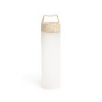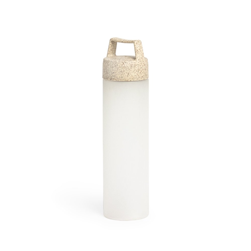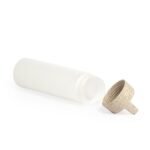 Garrafa plastica com capacidade de 650 ml, com tampa de fibra de arroz rosqueavel e alca.