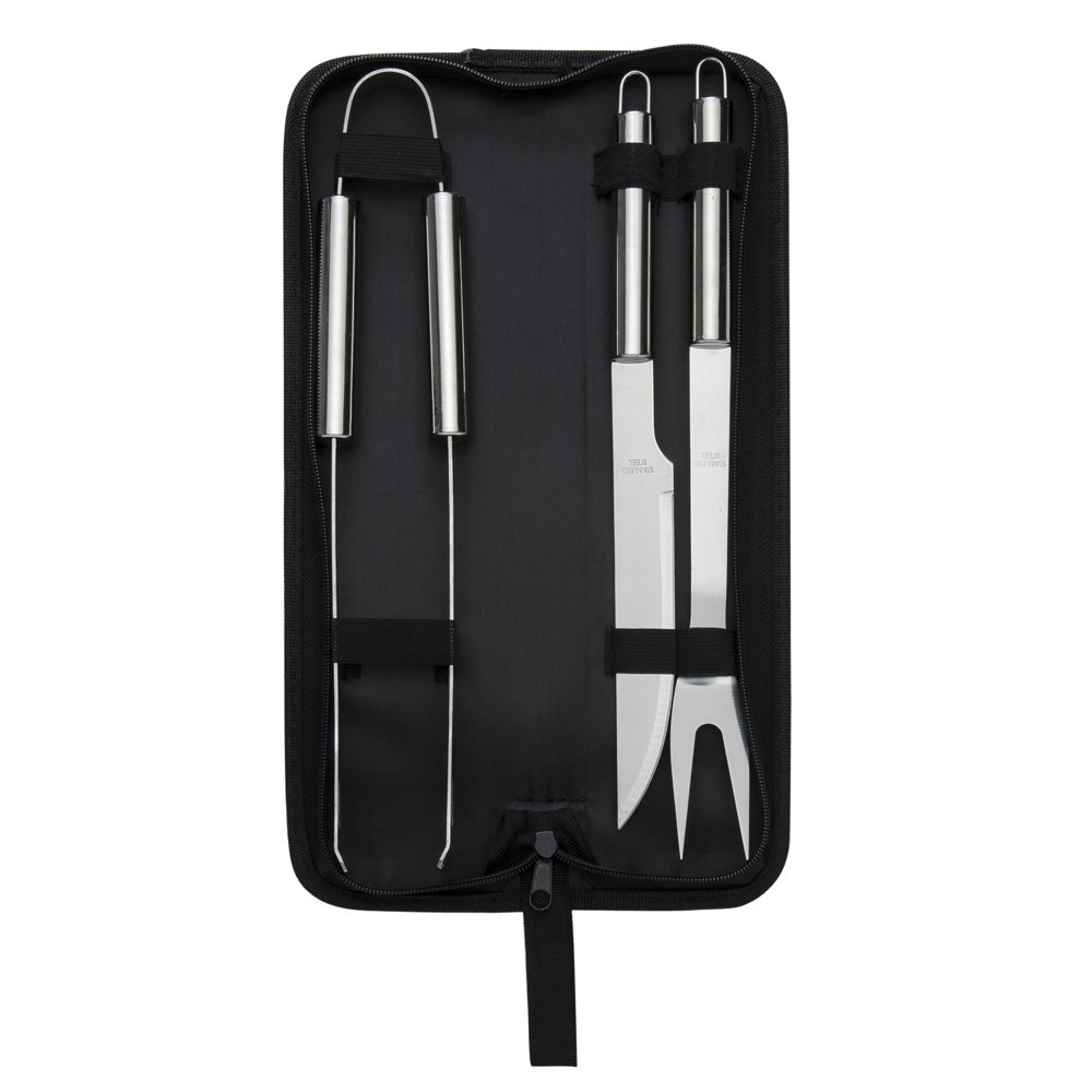 Kit churrasco 3 pecas em estojo de nylon com alca. Possui: faca(acompanha protecao plastica), garfo(acompanha protecao plastica), pegador em inox e parte interna com velcro para guardar as pecas. Acompanha plaqueta para gravacao.