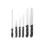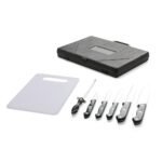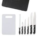 Um kit completo para ajudar na preparacao de um churrasco inteiro e deixar o momento de confraternizacao ainda melhor. Este conjunto traz 7 itens, incluindo 1 tabua em plastico, 1 chaira em aco inox, e 5 facas em tamanhos diferentes do mesmo material: 1 faca de legumes (com 3 polegadas de lamina), 1 faca de cozinha (com lamina de 4 polegadas), 1 faca de desossar (com lamina de 5 polegadas), 1 faca trinchante (com lamina de 7 polegadas) e 1 faca peixeira (com lamina de 8 polegadas). Tudo isso acompanhada por uma elegante maleta para facilitar a organizacao e o transporte do kit.
