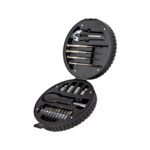 Kit ferramenta 20 pecas com estojo formato pneu em plastico resistente. Pneu preto com aro prata, possui trava lateral. Contem: 2 mini chaves de fenda e 2 mini chaves phillips, estilete, 4 extensores bocais(7MM, 8MM, 9MM e 10MM), chave canhao e conjunto 10 pontas(4 chaves phillips, 2 chaves fenda, 3 chaves torx e um adaptador).