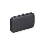Kit manicure 7 pecas em estojo de couro sintetico. Possui: dois cortadores de unhas, tesoura, lixa, pinca, empurrador de cuticula e espatula para ouvido. Parte interna de TNT com suporte de couro sintetico para fixar as pecas. Para abrir o estojo basta apertar o botao central.