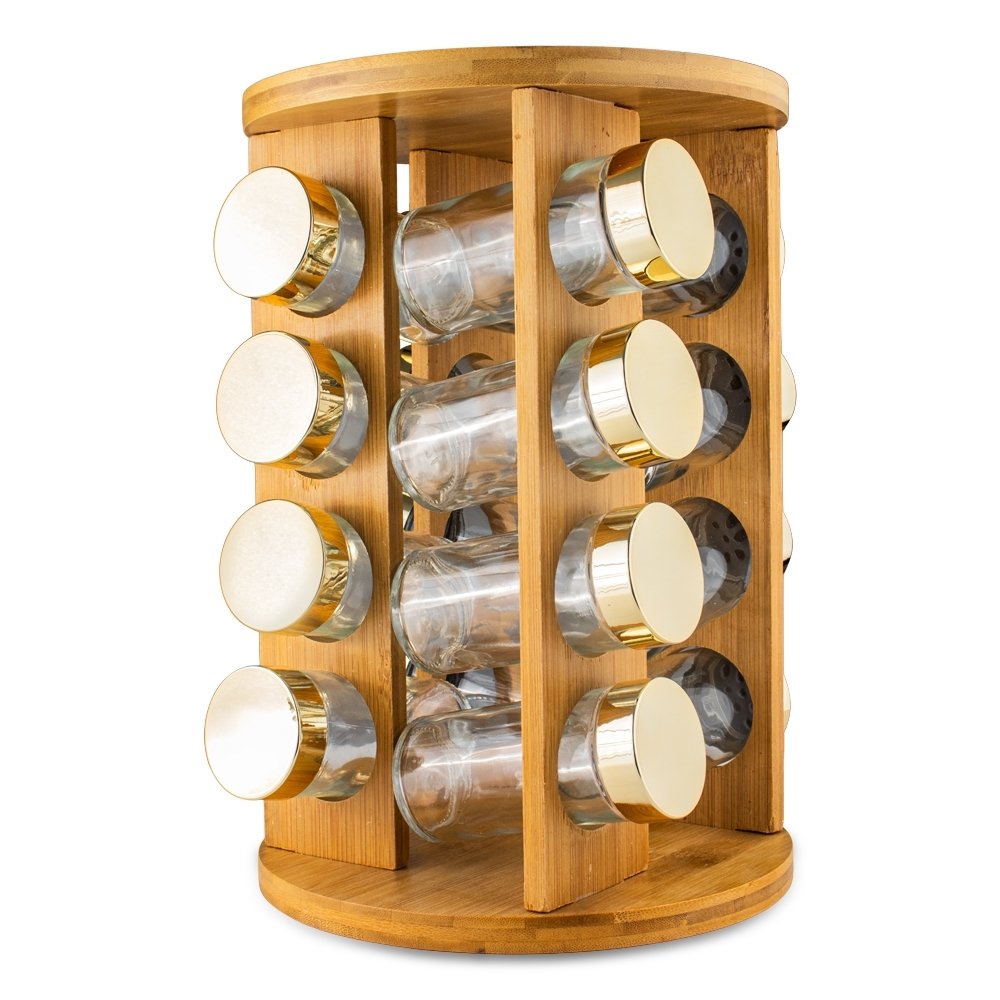 Garanta que os condimentos e temperos estejam sempre organizados. Funcional, contem 16 frascos de vidro de 85 ml, cada um possui duas tampas, sendo uma plastica dourada e outra com 11 perfuracoes, permitindo adicionar a dose certa ao preparar as receitas. Tudo isso em um suporte de bambu com base giratoria de 360° graus, que garante um acesso pratico e dinamico, alem de beleza sustentavel para o ambiente.