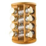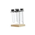 Kit porta temperos com cinco tubetes plasticos em base de madeira com estrutura metalica.