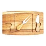 Kit queijo 3 pecas, contem: tabua de madeira com canaleta, faca com ponta, e garfo. Tabua com ima para encaixe e fixacao dos utensilios.