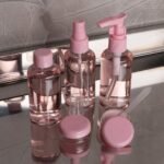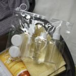 Kit viagem 6 pecas em estojo ziplock. Contem frasco de 80ml com tampa spray; frasco de 80ml com tampa rosqueavel; frasco de 80 ml com tampa pump; 2 potes de 10ml com tampa rosqueavel e mini espatula fosca. Frascos plasticos e estojo em pvc com puxador plastico.