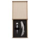 Kit vinho 2 pecas em estojo de madeira. Parte interna revestida com espuma, acompanha tampa de bico e saca-rolhas.