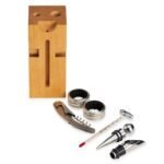 Kit vinho 6 pecas em cepo de madeira, contem tampa de bico, bico condutor com tampa, termometro, dois wine collars e saca rolhas metalico com abridor e lamina de corte.