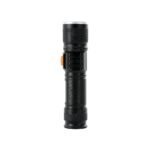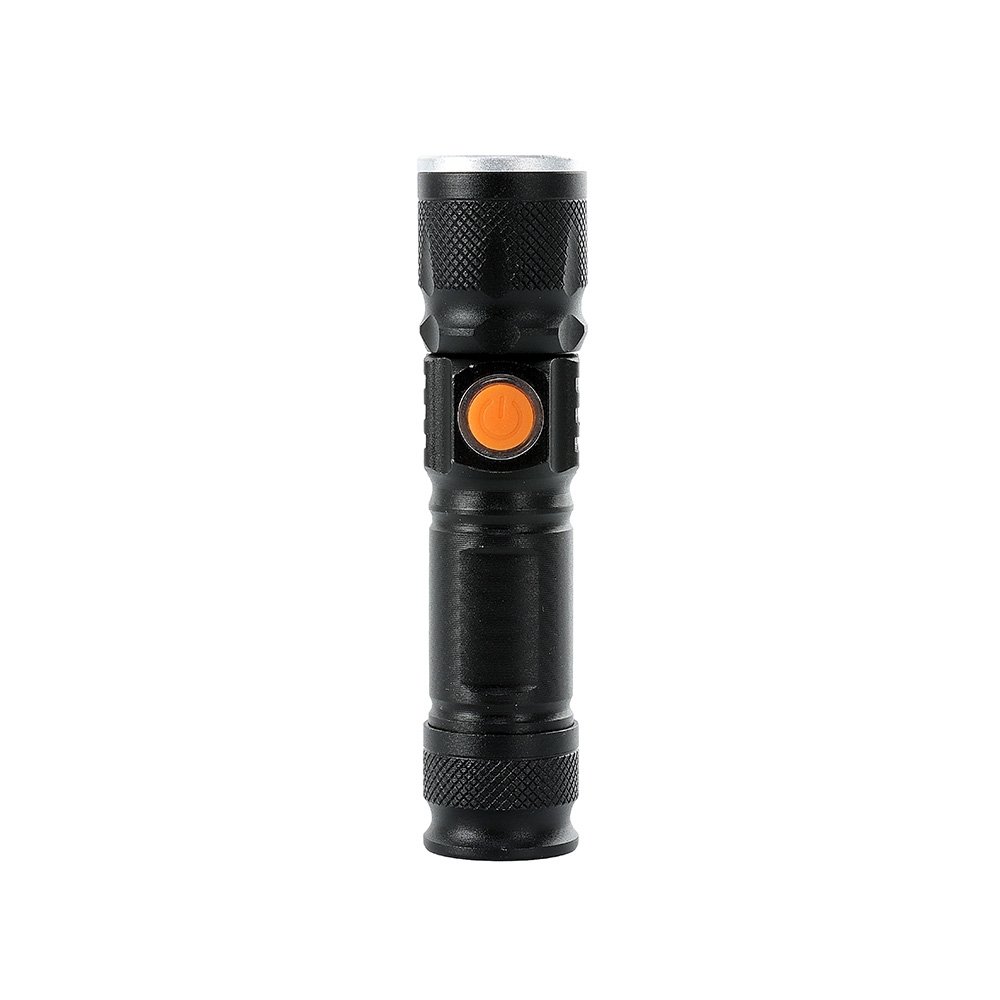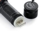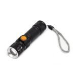 Lanterna led recarregavel com zoom de regulagem e tres estagios de iluminacao, material metalico com USB acoplado para carregamento. Acompanha cordao de nylon.