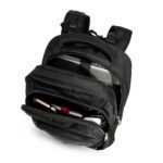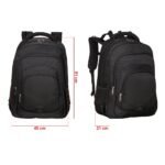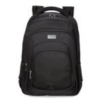 Mochila de poliester 42 litros com tres compartimentos, sendo o principal com bolso para notebook 156. Com divisorias internas para acessorios, a mochila possui bolsos laterais em malha, alca para encaixe em malas de viagem, alcas de compensacao, duas alcas de maos e area costada com revestimento espumado. Acompanha plaquinha metalica.