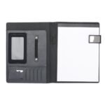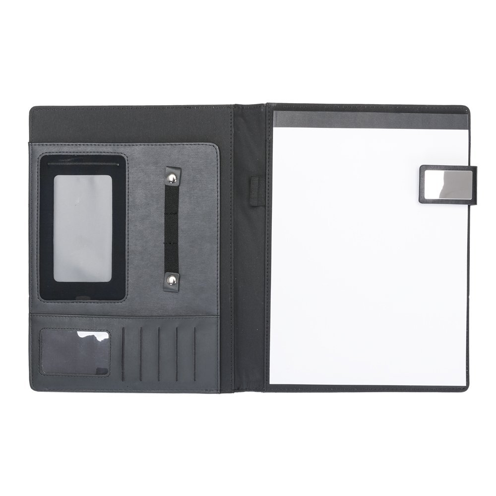 Pasta convencao de couro sintetico com trava de ima lateral, possui uma placa de metal na trava ideal para personalizacao. Possui “bolso” para arquivar documentos, porta celular com visor fosco, porta cartoes com divisorias e visor alem de um bolso atras, suporte elastico para caneta(nao acompanha) e bloco A4 com aproximadamente 20 folhas brancas pautadas de verso liso.
