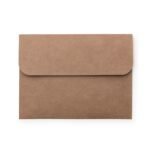 Pasta envelope ecologica, possui abertura superior fixada por um botao imantado. Detalhes costurados nas laterais, material em kraft.
