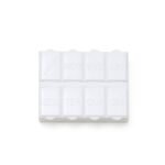 Porta comprimidos semanal de plastico branco fosco. Possui oito divisorias, sete delas escrito em relevo os dias da semana e a ultima escrito “reserva”. Verso liso. OBS.: PEDIDO MINIMO DE 50 PECAS!