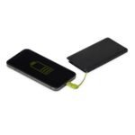 Carregador portatil plastico com 5.000mAh e indicador led de bateria. Possui entrada V8, acompanha cabo USB e adaptador lightning.
