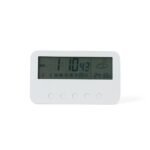 Relogio digital com alarme. Produzido em plastico, o relogio possui um display LCD com exibicao das horas, dias da semana, data, alarme, relogio de contagem progressiva e regressiva, temperatura, clima e umidade, parte frontal inferior com botoes para ajustes, e parte traseira com compartimento para 2 pilhas AAA (nao acompanha). Acompanha manual de instrucoes em ingles