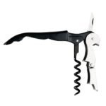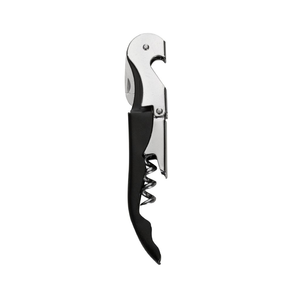 Saca-rolhas metalico de 2 estagios com acabamento brilhante. Contem abridor de garrafa, lamina de corte e saca-rolhas.