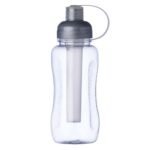 Squeeze plastico 600ml ice bar. Squeeze colorido acinturado com detalhe retangular texturizado nas laterais, possui tampa cinza com detalhe ondulado ao redor e tampa com alca para o bico. Parte interna possui uma barra congelante(desencaixe a barra da tampa), encha a barra e coloque no congelador/freezer para gelar e depois e so colocar novamente no squeeze.